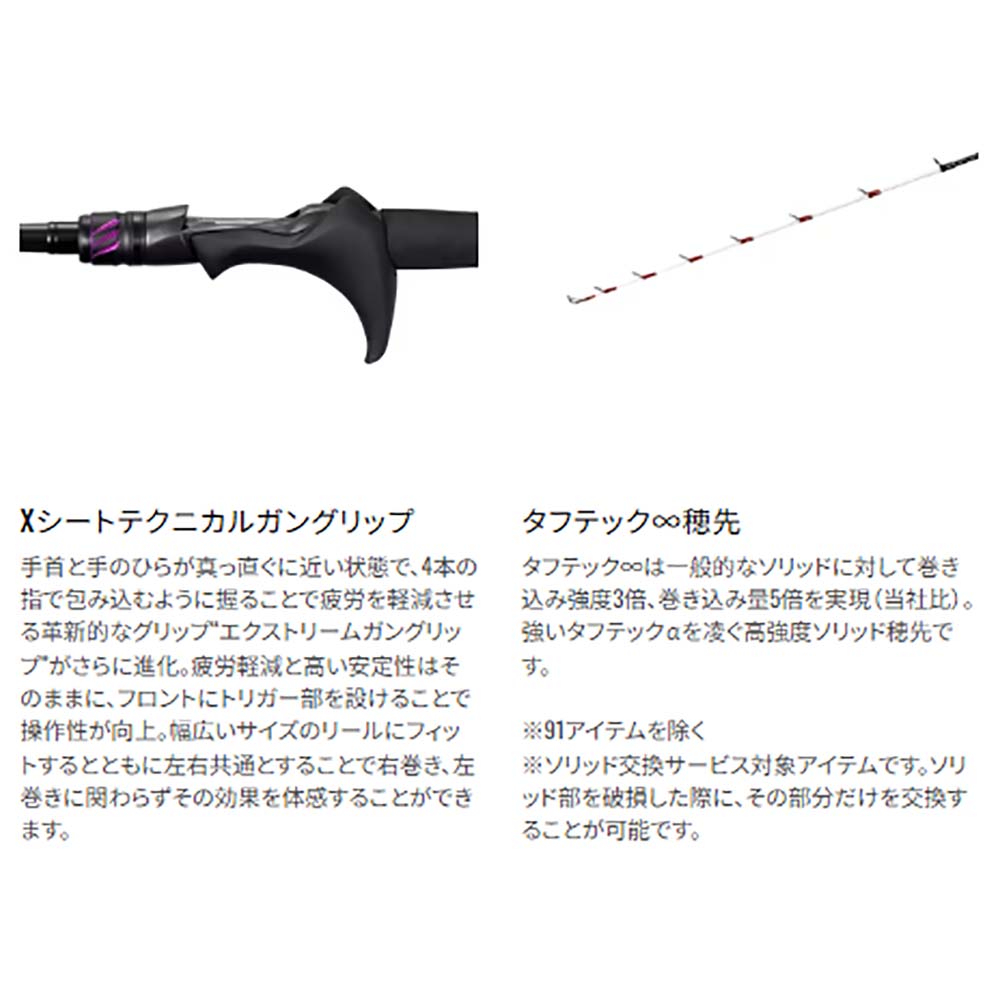 タチウオのアタリを探知する穂先部には、強度と感度に優れるカーボンソリッド タフテック∞を採用し(91シリーズは喰い込みが良く目感度にも優れたグラスソリッド穂先を採用)、カーボンテープで強化したハイパワーXソリッド構造とすることで感度・操作性が飛躍的に向上。ブランクスにはシマノ独自の基本構造スパイラルXを搭載し、テンヤ操作時やドラゴンタチウオとのファイト時における瞬時のパワー伝達性に優れ、テンヤタチウオ釣りにおける理想的なブランクスを追求。タックルと釣り人の接点となるリールシートには、ロッド性能を飛躍的に高めるXシートテクニカルガングリップを搭載。繊細なロッド操作を実現するフロントトリガーと、高いパーミング性能を発揮するガングリップ形状により、軽快かつ繊細な誘いの操作性とファイト時の安定感が向上。