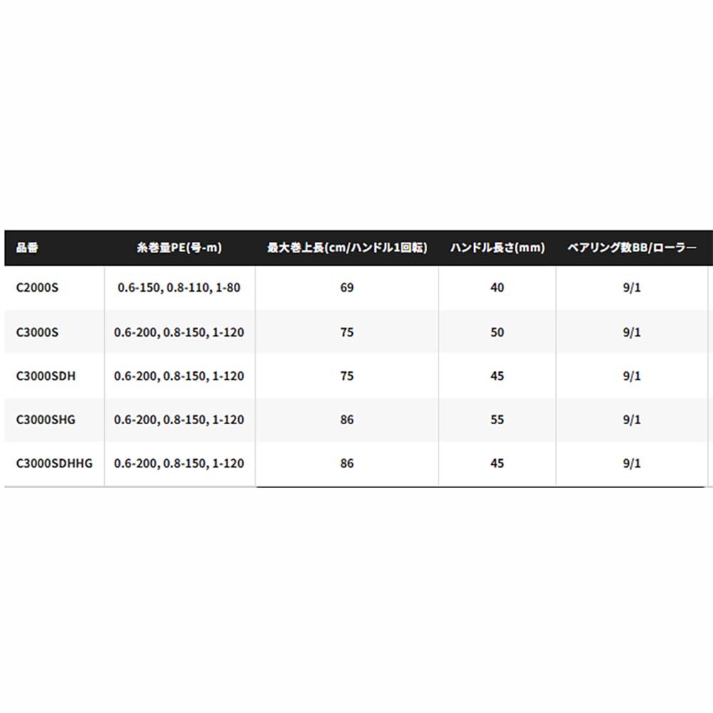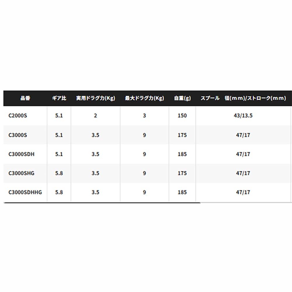 PE0.6号-200mのラインキャパ。ダブルハンドル仕様により、シャクった後にハンドルから手を離してもハンドルの自重で回転しないため余計な糸フケ回収の回避が可能。スピーディなアクションを行う場合や手返し、糸フケ回収の素早い操作に適したリールです。