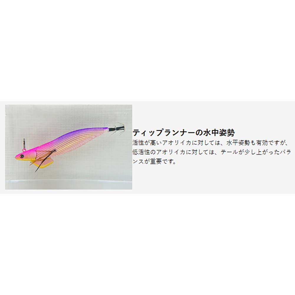 ティップラン専用エギ、ティップランナーは、フォールの速さ、シャクリの軽さ、ダートの切れの良さ、流水時の安定性、停止時の姿勢、針掛かりの良さ、等その他諸々 ティップランに必要とされる要素全てを独自に検証し、最善と呼べる性能を追求。
