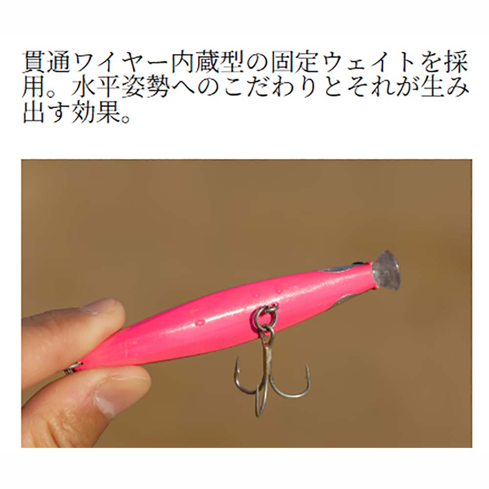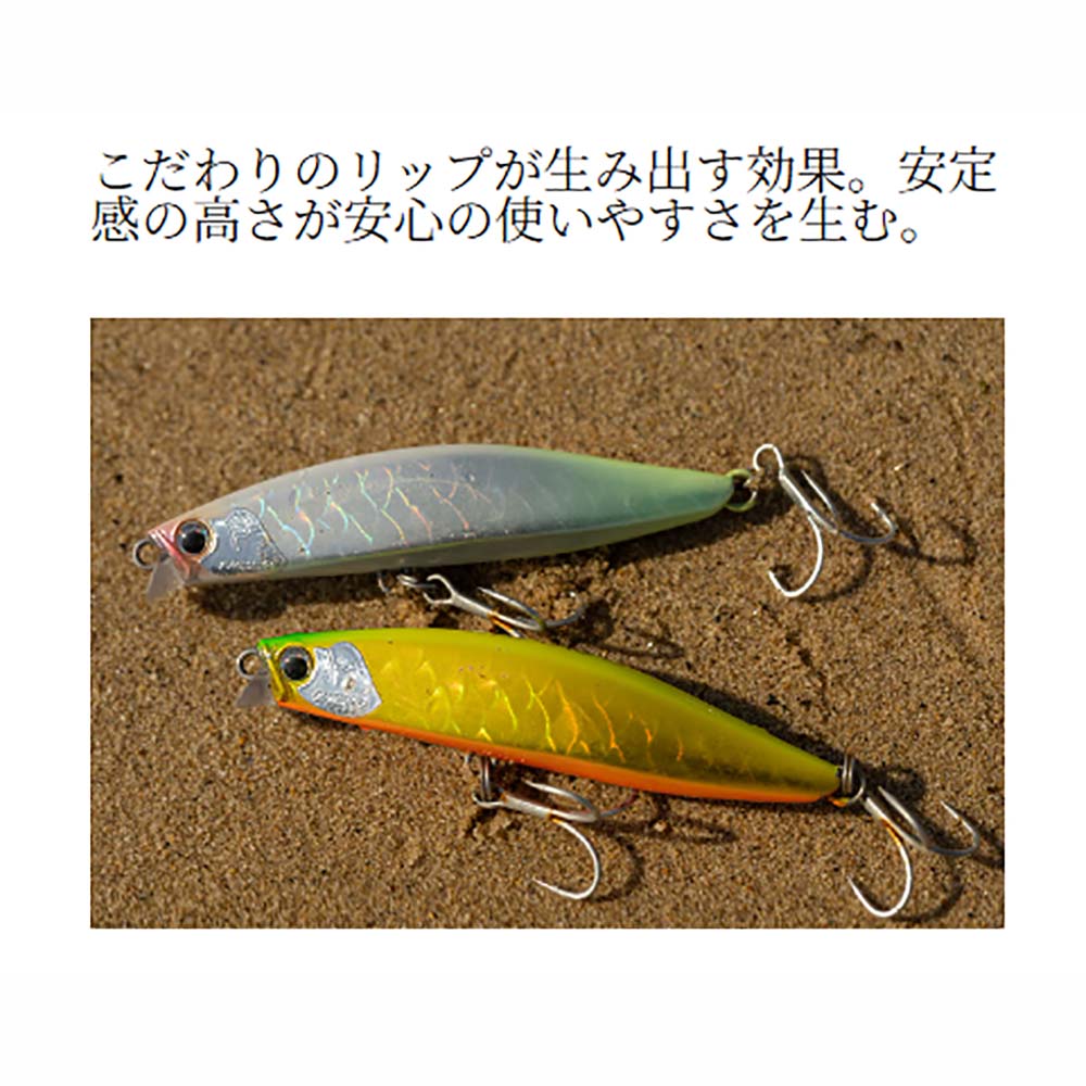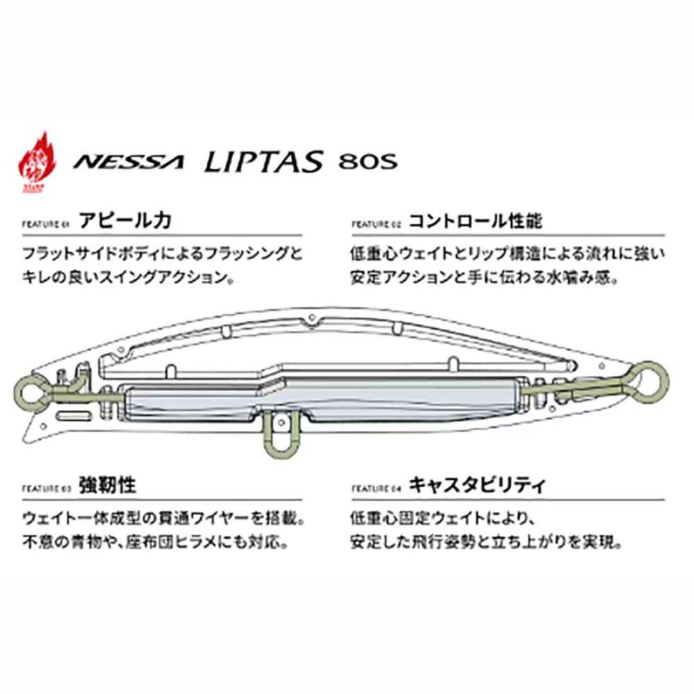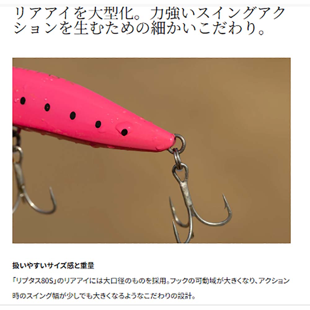 「リプタス80S」は小型リップを搭載したコンパクトサイズのシンキングペンシル。サーフのルアーに求められるアピール力、強靭性、コントロール性、キャスタビリティの4本の柱、そのすべてを充実させることを目的に設計した。大きな特徴のひとつである小型リップの効果で生み出されたアクションは、強いスイングアクションを発生させ、広大なサーフで存在感を発揮。またメインウェイトを貫通ワイヤー内蔵型の固定ウェイトにすることで、一般的な貫通ワイヤー構造に比べてさらなる低重心化に成功している。これにより飛行姿勢、シミーフォール、複雑な流れの中での泳ぎに対して安定性が向上。コンパクトサイズでありながら遠投が得意で、優れたキャスタビリティまで実現した。シンキングペンシルならではの遠投性能を活かして遠くを狙いたい、それでいてミノーのような強いアピール力も欲しい、そんなときに活躍するのがこの「リプタス80S」である。